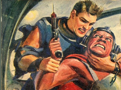 With one hand, I slapped the pistol aside, to keep from being shot. With the other hand, I thrust the butt of the gun at this throat, but connected with his chest. Braced as I was against the co-pilot’s chair, he was thrown backward and his knife tumbled from his hand.