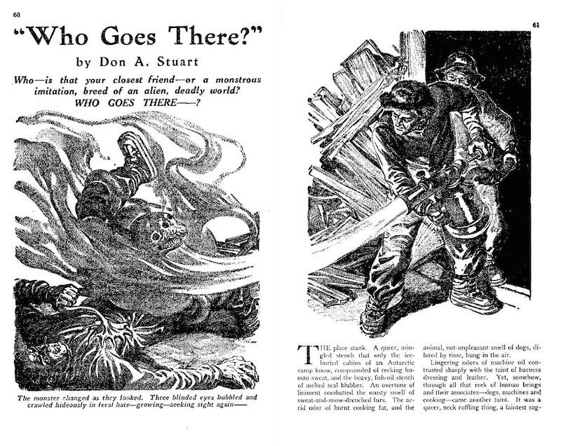 There are multiple versions of Who Goes There? available. The original, twelve chapter version was used for this essay, though it is currently hard to get. One with fourteen chapters was published for later collections, and is currently easier to get your hands on. More recently, a full, previously unknown novel was discovered and published as Frozen Hell. It seems Campbell had to cut this story down to make it fit in the magazine.